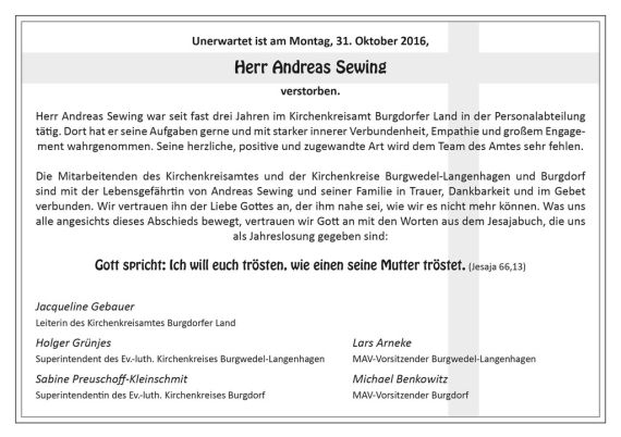 Unerwartet ist Andreas Sewing, Mitarbeiter des Ev.-luth. Kirchenkreisamtes Burgdorfer Land, am 31. Oktober verstorben.