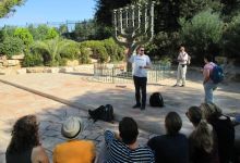 Jens Wening erklärt die Motive auf der Knesset-Menorah, einem monumentalen Bronzeleuchter vor dem Parlamentsgebäude. -