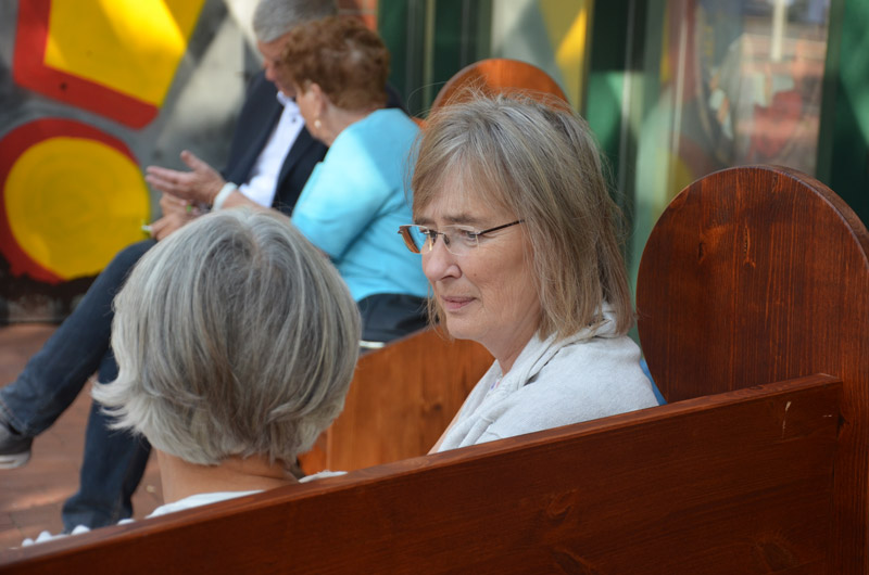 Birgit Baumann und Sabine Behrens hören etwas andere Geschichten: von Krankheit und Durchhaltewillen, von fehlendem Gemeinsinn, von Erlebnissen mit der Familie und in der Stadt. Auch sie hören genau hin, fragen nach und behalten das Gehörte im Kopf. Am nächsten Sonntag wollen sie in der Emmaus-Kirche von dem Gehörten berichten und es im Gottesdienst thematisieren. Dann werden auch Vertreterinnen der Polizei, des Seniorenbeirates und der Wohnungsbaugesellschaft KSG von dem berichten, was ihnen zu Ohren gekommen ist: Die drei Kirchenbänke vom Marktplatz werden in der Woche der Diakonie ein zweites Mal auf einem Spielplatz in Wiesenau aufgebaut.