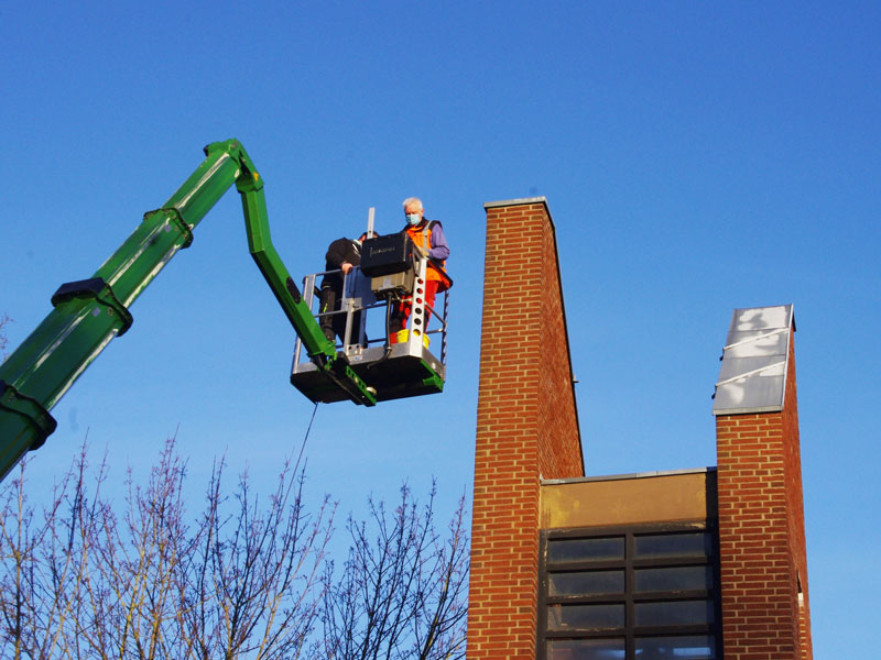 Vor wenigen Tagen wurde die Radioantenne auf dem Glockenturm der Kirchengemeinde Elze montiert: Von einem Hubwagen aus arbeiteten zwei Techniker in zwölf Meter Höhe und brachten die Antenne mit einem Verlängerungsrohr 15 Meter über dem Boden an. Anschließend wurden rund 100 Meter Antennenkabel um das Kirchgebäude herum bis in die Sakristei verlegt. „Jemand muss heute mit einem wohlwollenden Auge auf unser Vorhaben geschaut haben“, sagte der Kirchenvorstandsvorsitzende Bernhard Orlowski zum Abschluss der Arbeiten. „Es war Regen angesagt, aber den ganzen Tag über herrschte strahlender Sonnenschein.“
