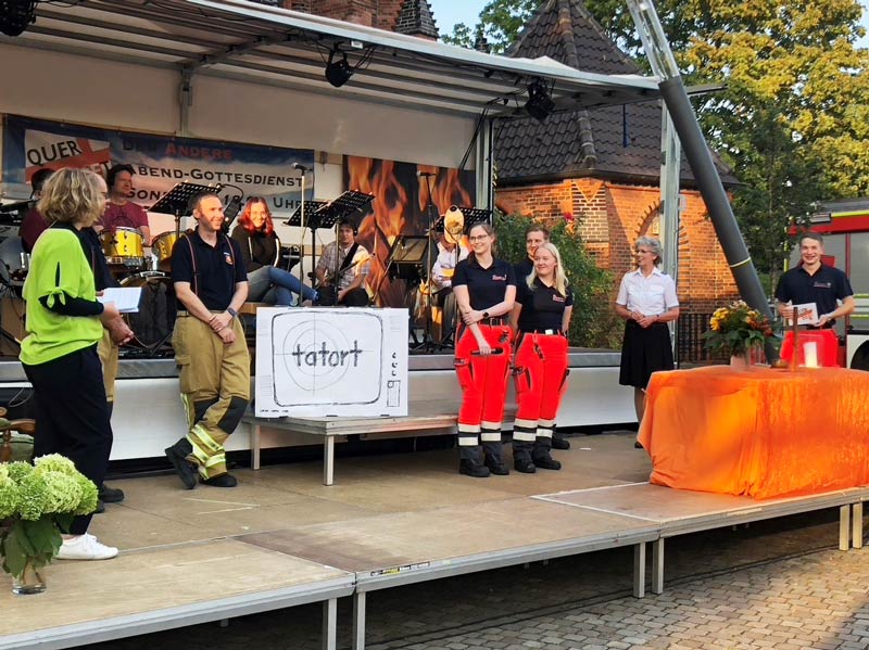 Rund 150 Gäste waren zum Abendgottesdienst unter freiem Himmel vor die Elisabethkirche gekommen, unter ihnen zahlreiche Ehrenamtliche aus der Feuerwehr und von den Johannitern – der Abendgottesdienst stand unter der Überschrift „Es brennt. Querbeet mit Blaulicht“.