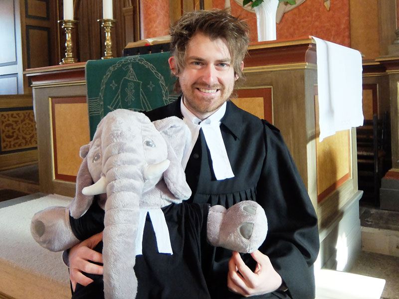 „Der Elefant im Talar ist ja toll“, freut sich Cora Willenbücher aus dem Kirchenvorstand der Martinskirchengemeinde, als sie das große Kuscheltier von Vikar Hendrik Hundertmark erblickt. „Da ist so viel Symbolik drin: Kraft, Stärke und eine dicke Haut braucht ein Prediger doch auch.“