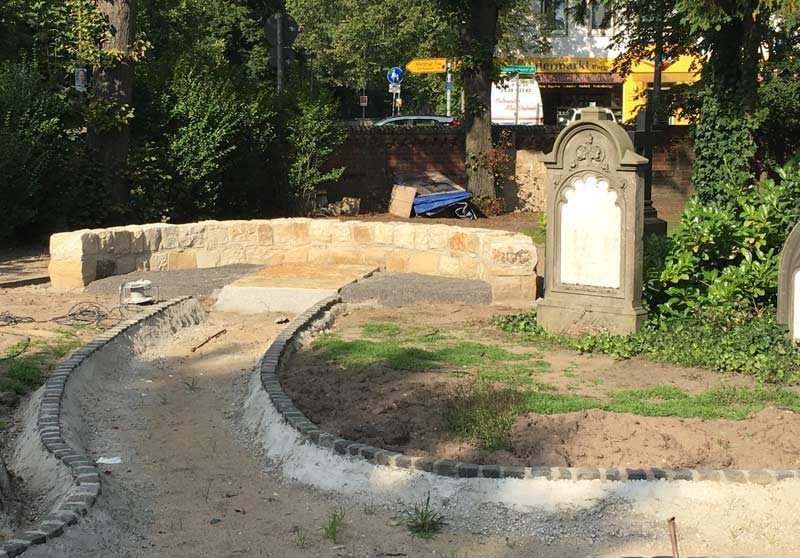 Auf dem alten Teil des Friedhofes an der Kreuzung zu Domfrontplatz und Rathaus, wo früher anonyme Bestattungen möglich waren, soll nun eine neue Abteilung entstehen, die von Friedhofsgärtner Jörg Krauthoff und seinem Team kontinuierlich instand gehalten werden soll – für Angehörige entsteht somit kein Pflegeaufwand. Steinmetzmeister Andreas Textores wurde beauftragt, die weitere Anlage der Gedenkstelle in Form eines Halbmondes zu fertigen. Hier können später die Namen sowie Geburts- und Sterbejahr der Verstorbenen eingelassen werden. Ein Gehweg führt Besucherinnen und Besucher von zwei Seiten zu der Gedenkstelle. „Die Gehwege wurden besonders breit angelegt, damit auch Angehörige mit Rollator oder Rollstuhl problemlos zur Gedenkstelle gelangen können“, erklärt Pascal Bade vom Kirchenkreisamt Burgwedel.