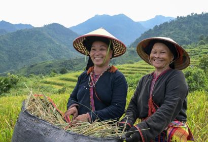 Unterstützt von der Yen Bai Womens‘ Union (YBWU), einer Projektpartnerin von Brot für die Welt, engagieren sich Frauen in Vietnam bei der Reisernte. Foto: Jörg Böthling / Brot für die Welt