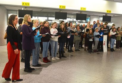 2022 lud Sabine Kleinau-Michaelis mit ihren Chören zum ersten Mal zum Flashmob im Flughafen ein. Auch in diesem Jahr haben die Chöre dort wieder einen Einsatz. Foto: Andrea Hesse