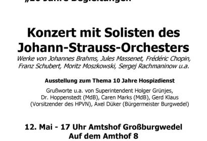 Anlässlich seiner Jubiläumsveranstaltung „10 Jahre Begleitungen“ lädt der Ambulante Hospizdienst Burgwedel – Isernhagen – Wedemark zu einem Konzert mit Solisten des Johann-Strauß-Orchesters Hannover ein. Das Konzert beginnt am Freitag, 12. Mai, um 17 Uhr im Amtshof in Großburgwedel. Auf dem Programm stehen Werke von Johannes Brahms, Jules Massenet, Frédéric Chopin, Franz Schubert, Moritz Moszkowski, Sergej Rachmaninow und anderen.