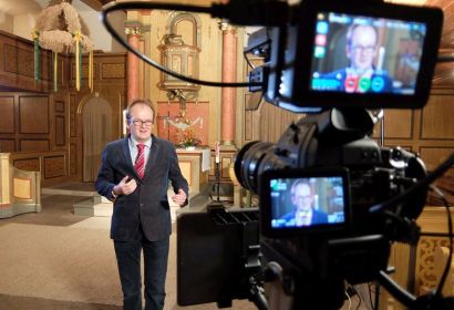 „Lass uns das mal ausprobierten“, motivierte der Fernsehmann Kai-Fabien Rolf Pastor Rainer Müller-Jödicke. Rolf steht sonst hauptberuflich hinter der Kamera und gestaltet ehrenamtlich das Layout der Martinskirchengemeinde. Er filmte auch schon verschiedene Videobotschaften des Landesbischofs. Nun baute er seine Technik in der Engelbosteler Kirche auf: eine Kamera und vor allem viel Licht!